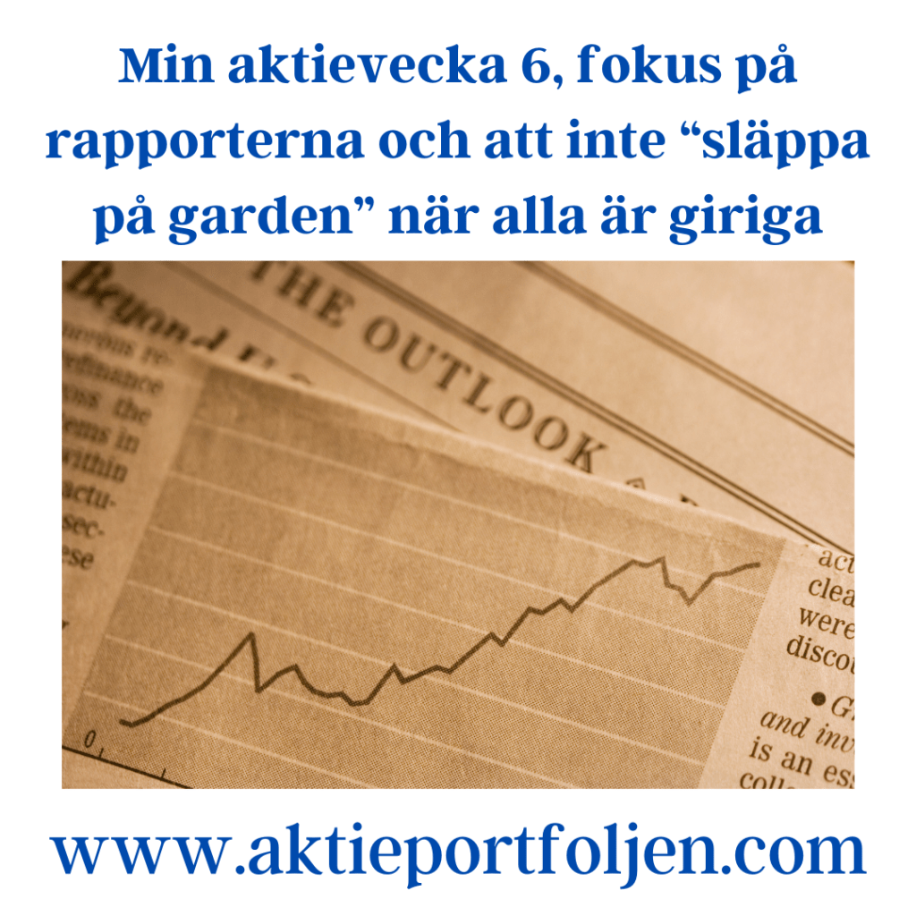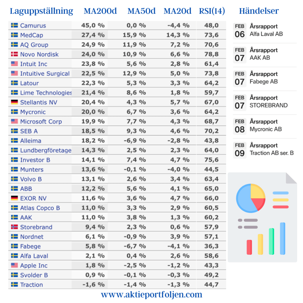 Jag håller en hel laguppställning där alla trendar starkt över sitt MA200 och med den här strategin kan jag utmana index, samtidigt drar jag ner på risken genom alternativa placeringar. Kommande veckar jag sex rapporter att se fram emot från industribolaget Alfa Laval, specialfettbolaget AAK, fastighetsbolaget Fabege, försäkringsjätten Storebrand, mönsterritarbolaget Mycronic och investmentbolaget Traction. Bästa trendarna är forskningsbaserade läkemedelsbolaget Camurus, medecinteknikbolaget Medcap och verkstadsbolaget AQ Group.