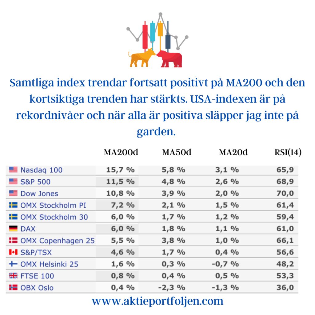 Samtliga index trendar fortsatt positivt på MA200 och den kortsiktiga trenden har stärkts. USA-indexen är på rekordnivåer och när alla är positiva släpper jag inte på garden.