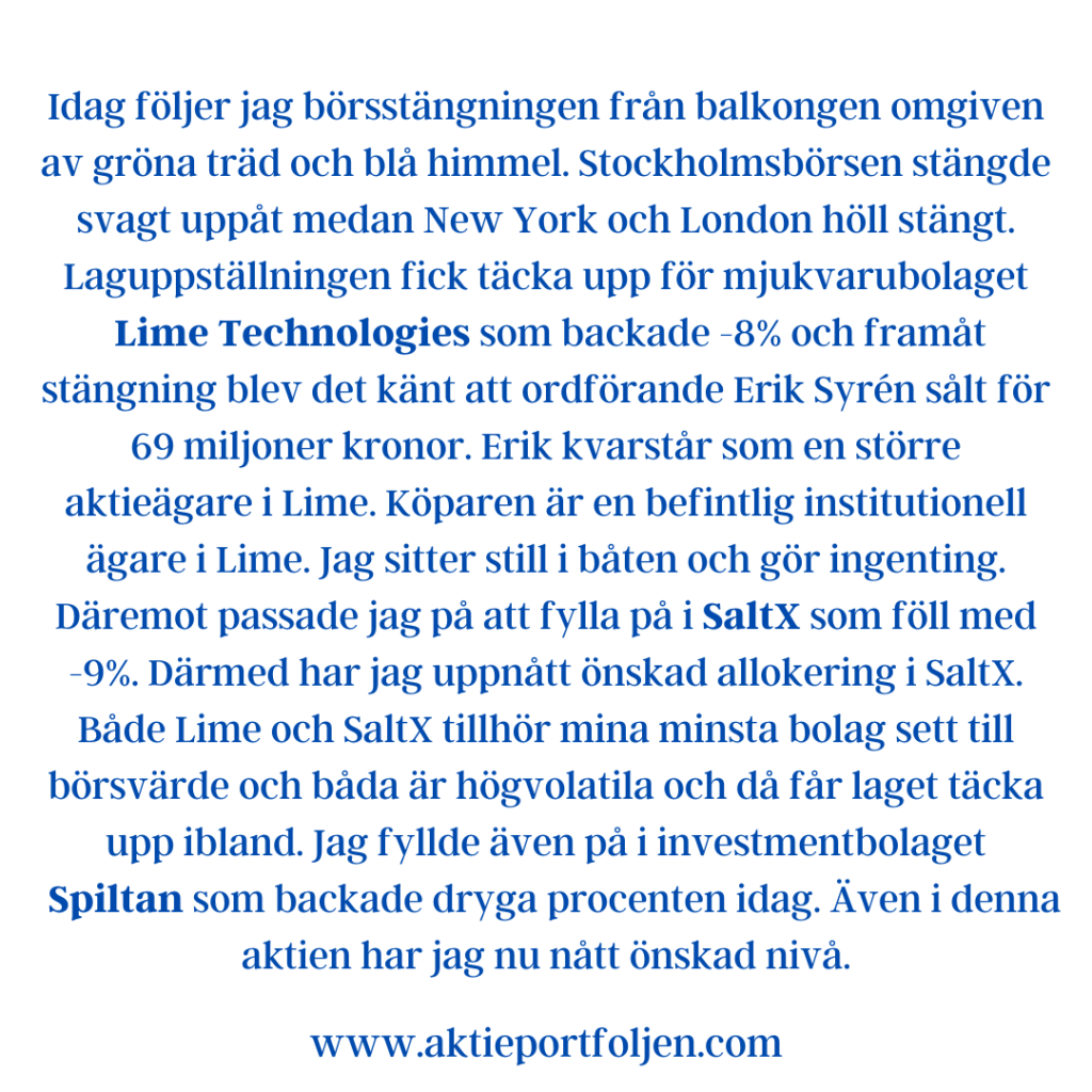 Varje handelsdag kommer någon också sist och idag blev det ljudboksbolaget Storytel som stängde på -2,06%. Det verkar inte finnas någon nyhet kopplad till nedgången.