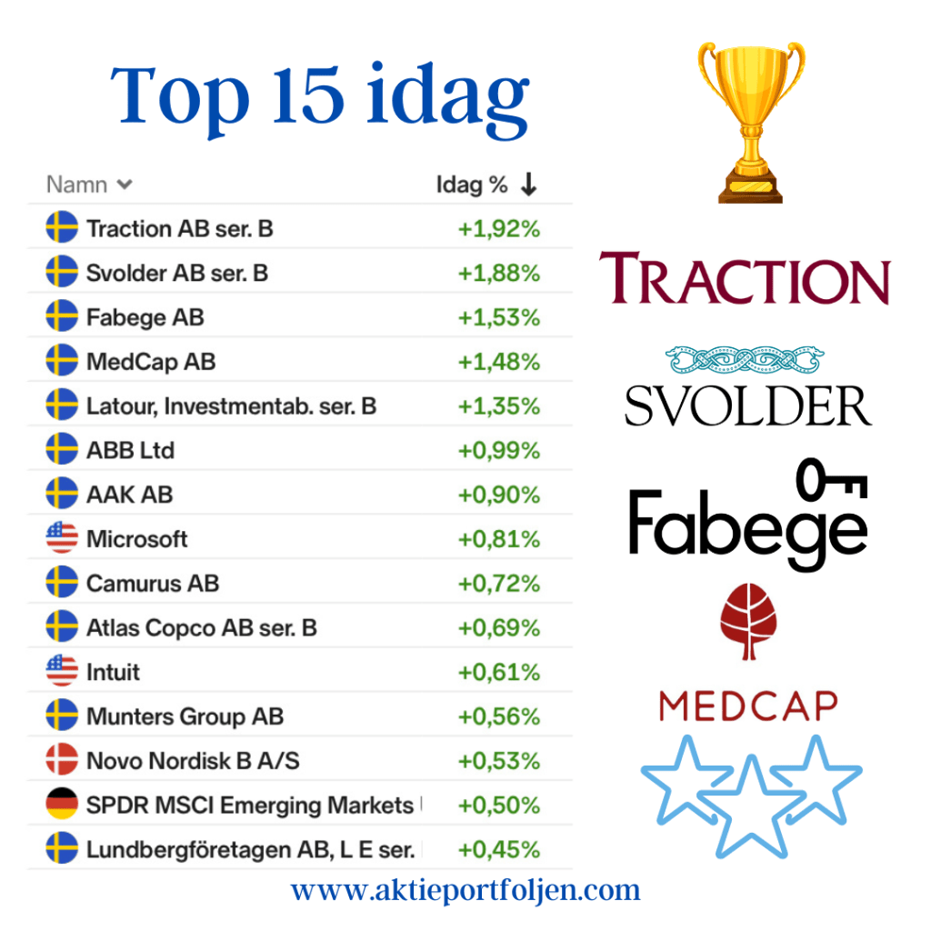 Dagens ledartröja gick till robotkirurgibolaget Intuitive Surgical som steg utan direkta nyheter på ett positivt Wall Street. Andraplatsen gick till Greentechbolaget SaltX som gick bra inför morgondagens rapport. SaltX har en intressant elektrifieringsteknik som kan ersätta fossila bränslen vid industriprocesser. ABB är involverade som delägare och partner i kommersialiseringen av tekniken. ETF:en Emerging Markets knep tredjeplatsen. Techjätten Microsoft sällade också sig till vinnarkvartetten och aktien fick säkert en puff uppåt av nyheten att Microsoft skall satsa mer än 10 miljarder dollar i utveckling av förnybar energikapacitet för att möta den växande efterfrågan på artificiell intelligens och datacenter.