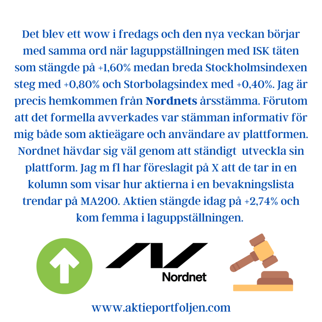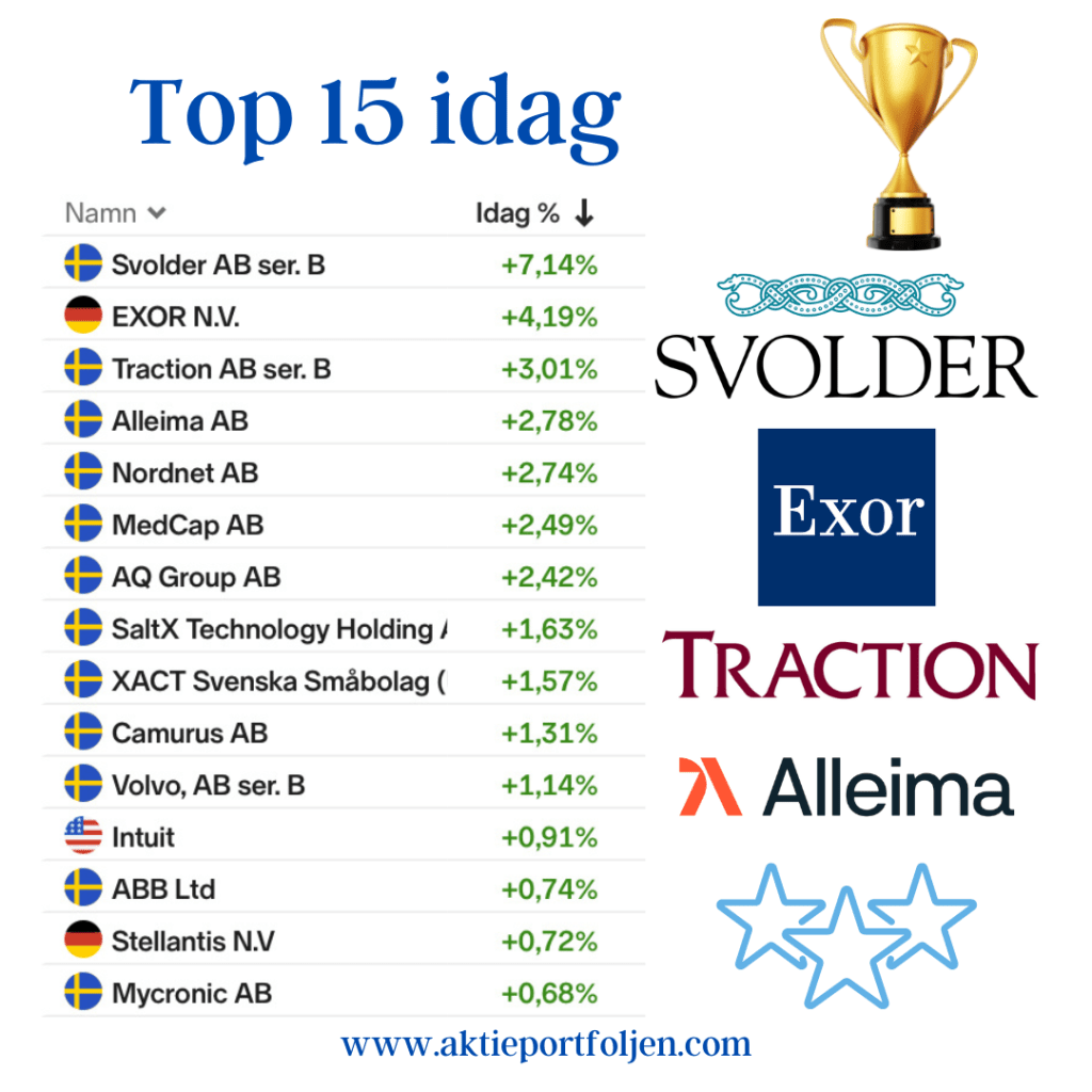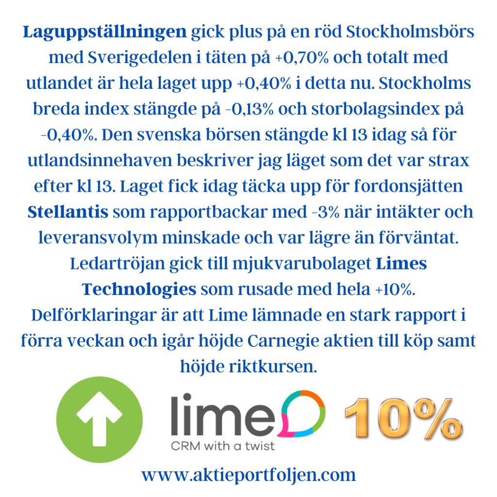 Stockholmsbörsen hade en tung dag jämfört med övriga Europa, storbolagsindex backade med -1,20 och breda index med -1,11%. För laguppställningen ser det grönt ut på Top 15 listan, men laget fick täcka upp för bl a Lime Technologies och Fortnox som backade med rejält. Å andra sidan steg Lime med 10% i tisdags, så det gjordes säkert en del vinsthemtagningar idag. Bättre går det på Wall Street som är upp dryga procenten.