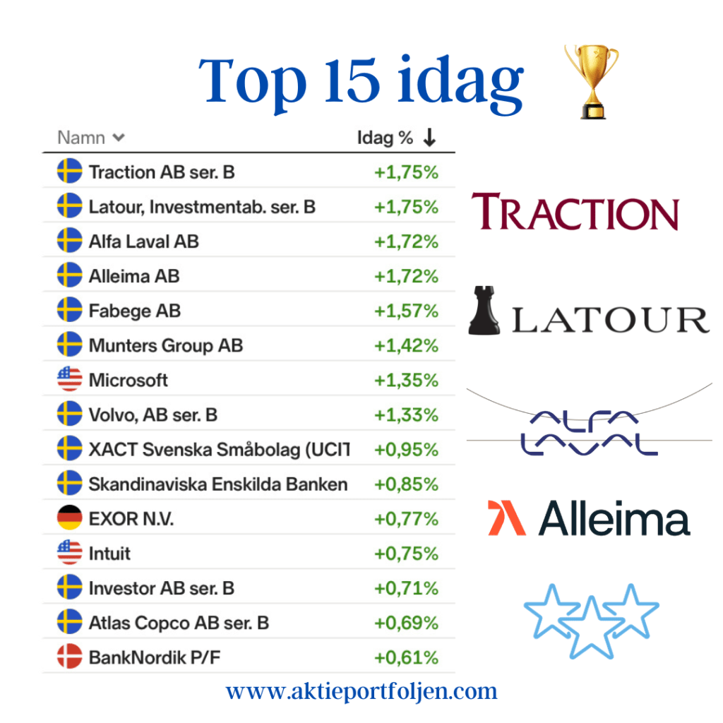 Det ser riktigt mysigt ut när jag släckte taklampan och tog omslagsbilden på skärmarna. Laguppställningen gjorde en fin insats idag med Sverigeportföljen i täten som steg över +1,0%. Stockholmsindexen var hack i häl med OMX30 och OMXSPI som stängde på +0,60% respektive+0,80%. Roligt att lagets nykomling Nordnet tog hem ledartröjan idag. Som Nordnet-användare måste jag säga att plattformen fungerar utmärkt och det märks att Nordnet har ambitionen att bli bäst på Private Banking. Camurus fortsätter stiga inför rapporten på torsdag och är med råge lagets bästa trendare på MA200. Trea kom Traction vars innehav Nilörngruppen rusade idag. Imorgon får vi veckans makrohöjdpunkt då USA:s inflationsutfall redovisas för januari. En viktig pusselbit för Fed inför kommande räntebeslut.