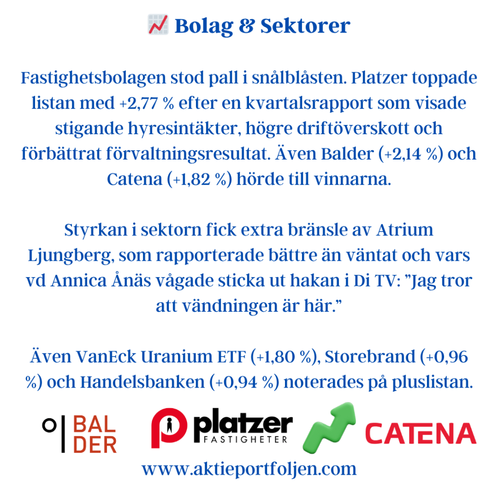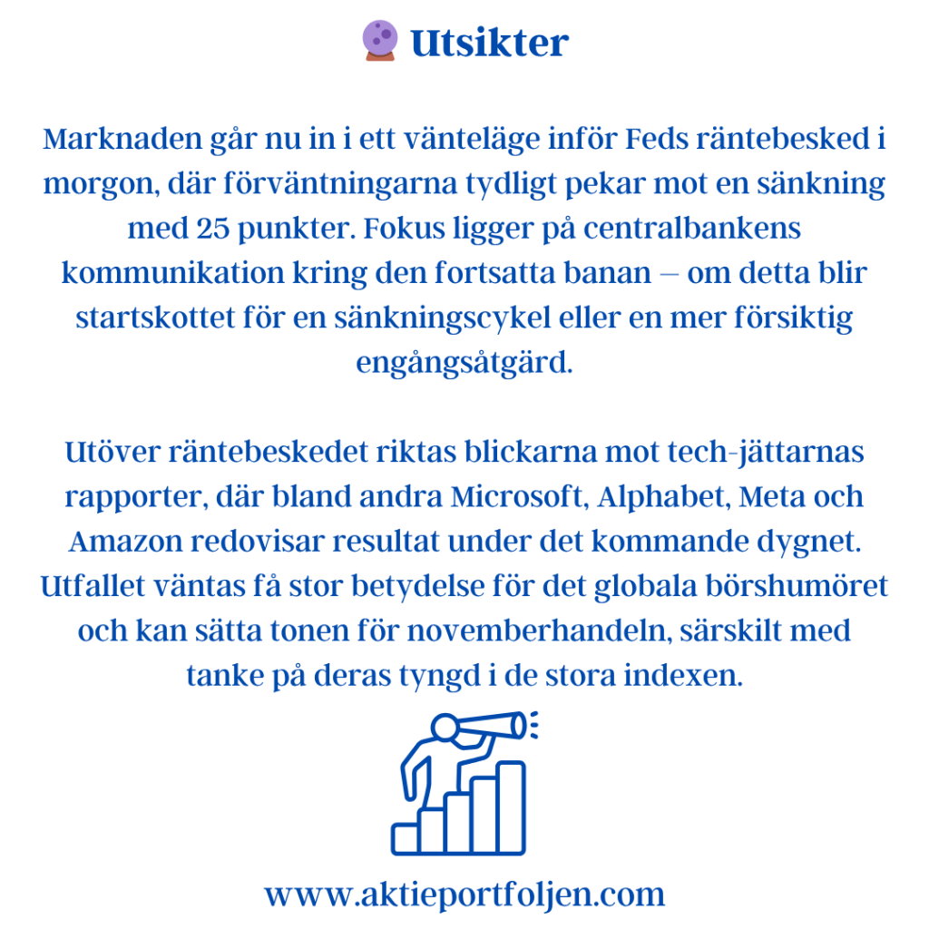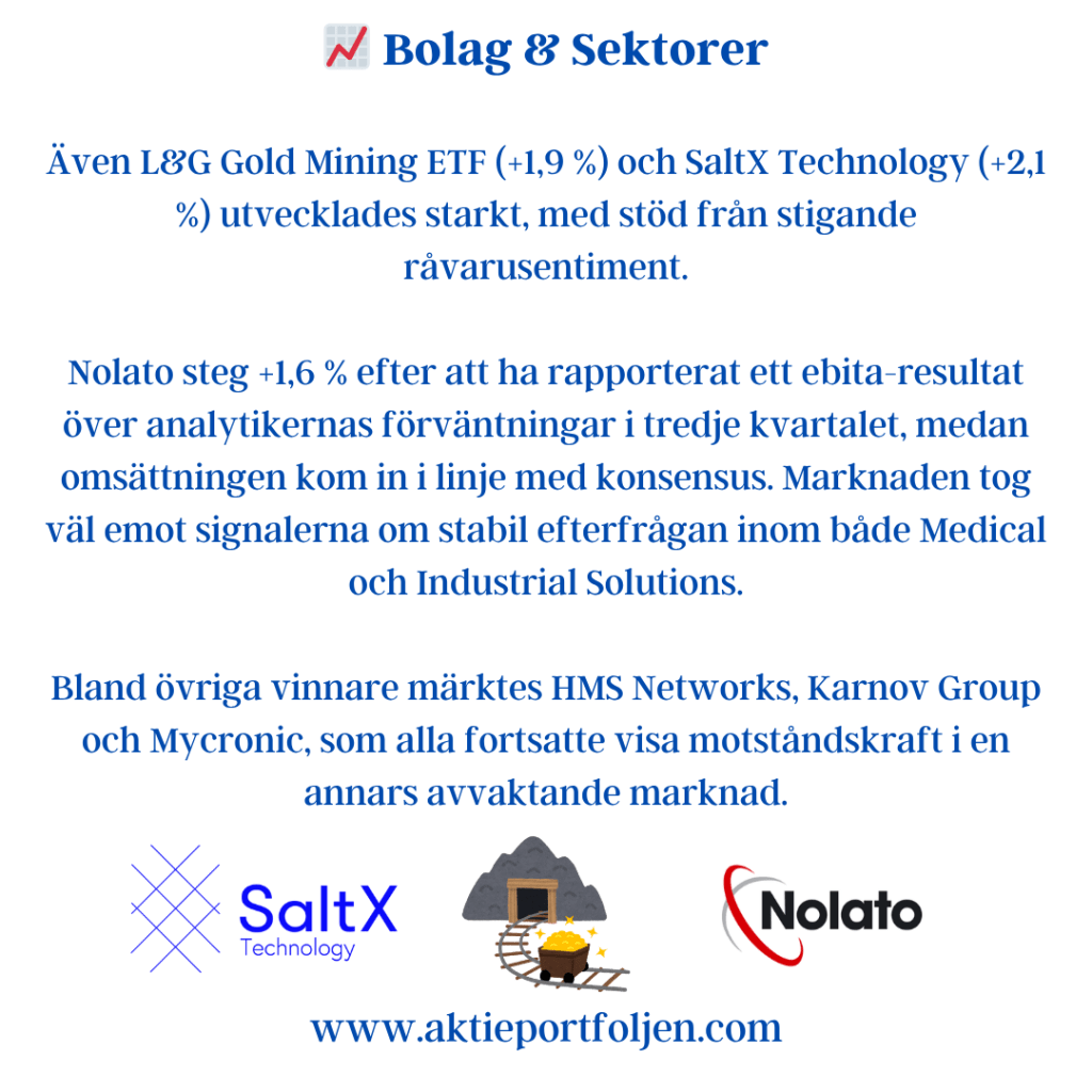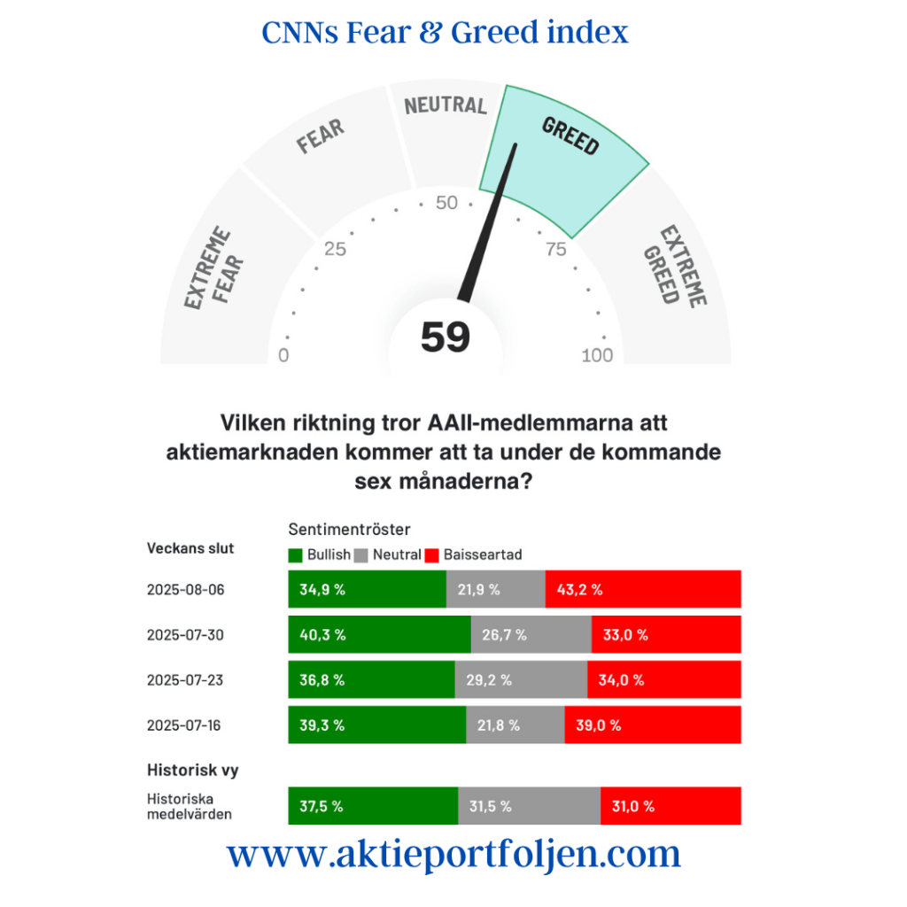 Sentimentbilden är fortsatt balanserad men tydligt mer vaksam i USA än i Europa. För Stockholmsbörsen visar Swedbanks Fear & Greed-indikator ett värde kring 61, vilket placerar marknaden på girighetssidan men fortfarande utan tydliga överhettningstendenser. Riskaptiten är därmed intakt, men selektiv.