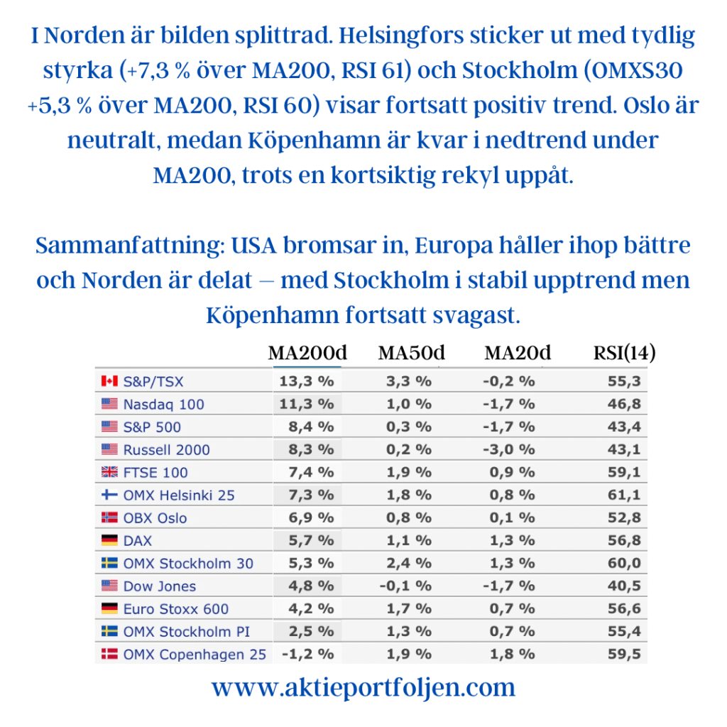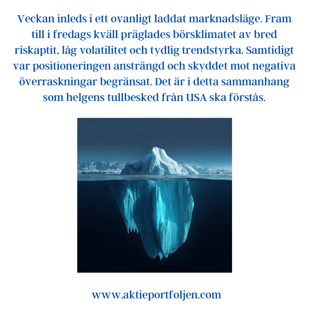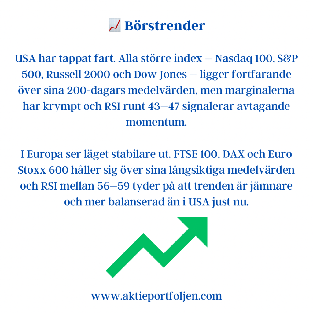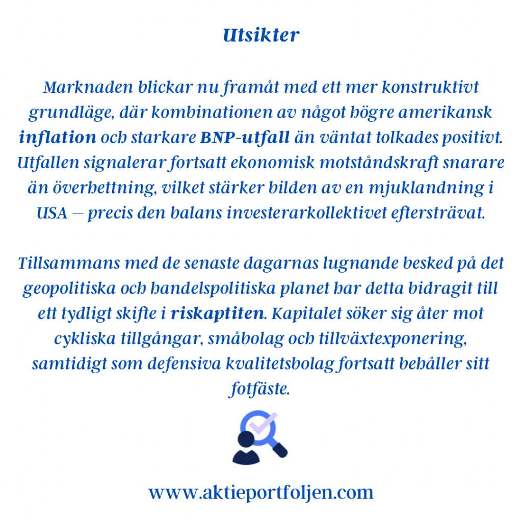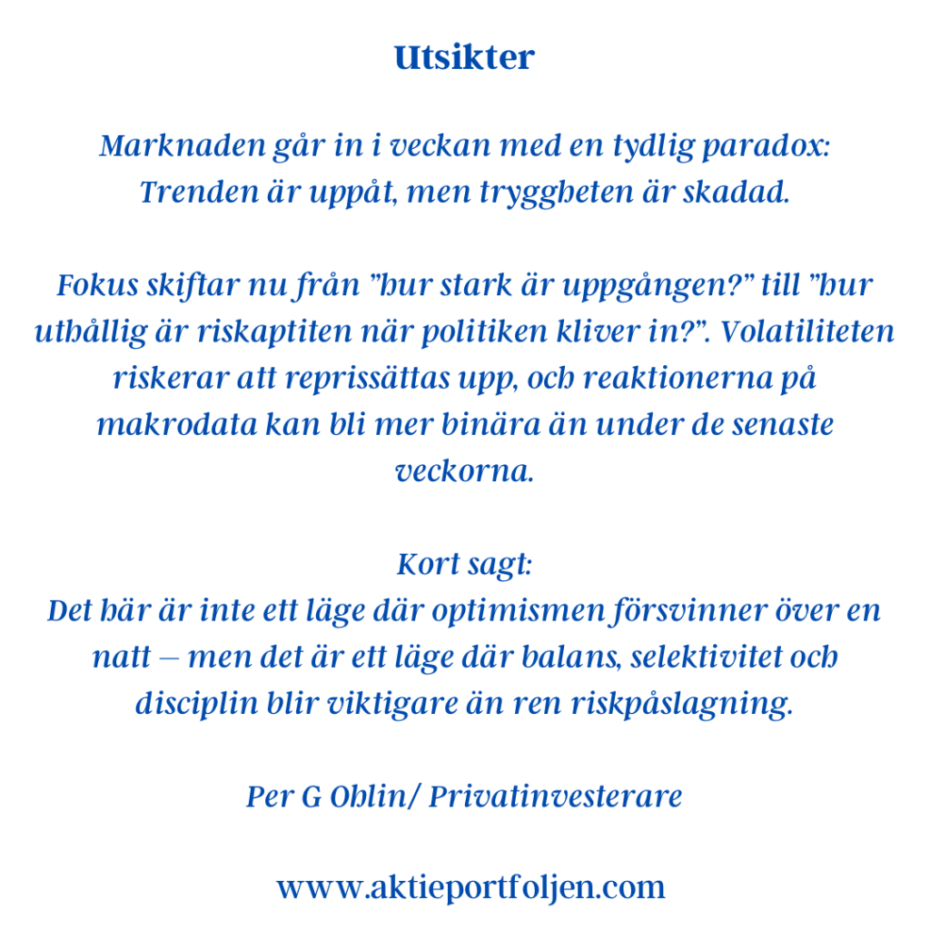 Sammantaget visar indikatorerna ett marknadsläge där riskaptiten finns kvar, men där toleransen för negativa överraskningar är begränsad. Varje nytt politiskt besked eller makroutfall får därmed större genomslag än i ett mer trenddrivet klimat.