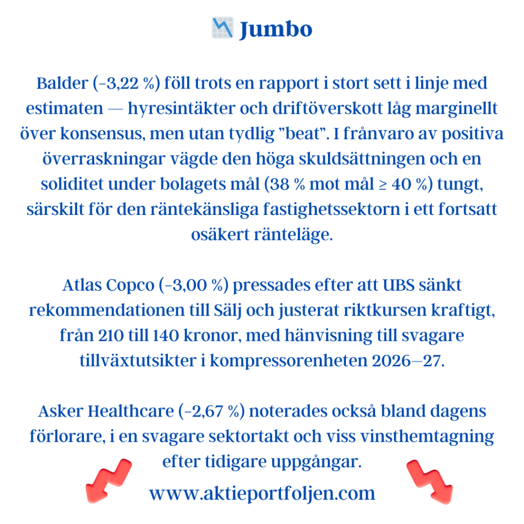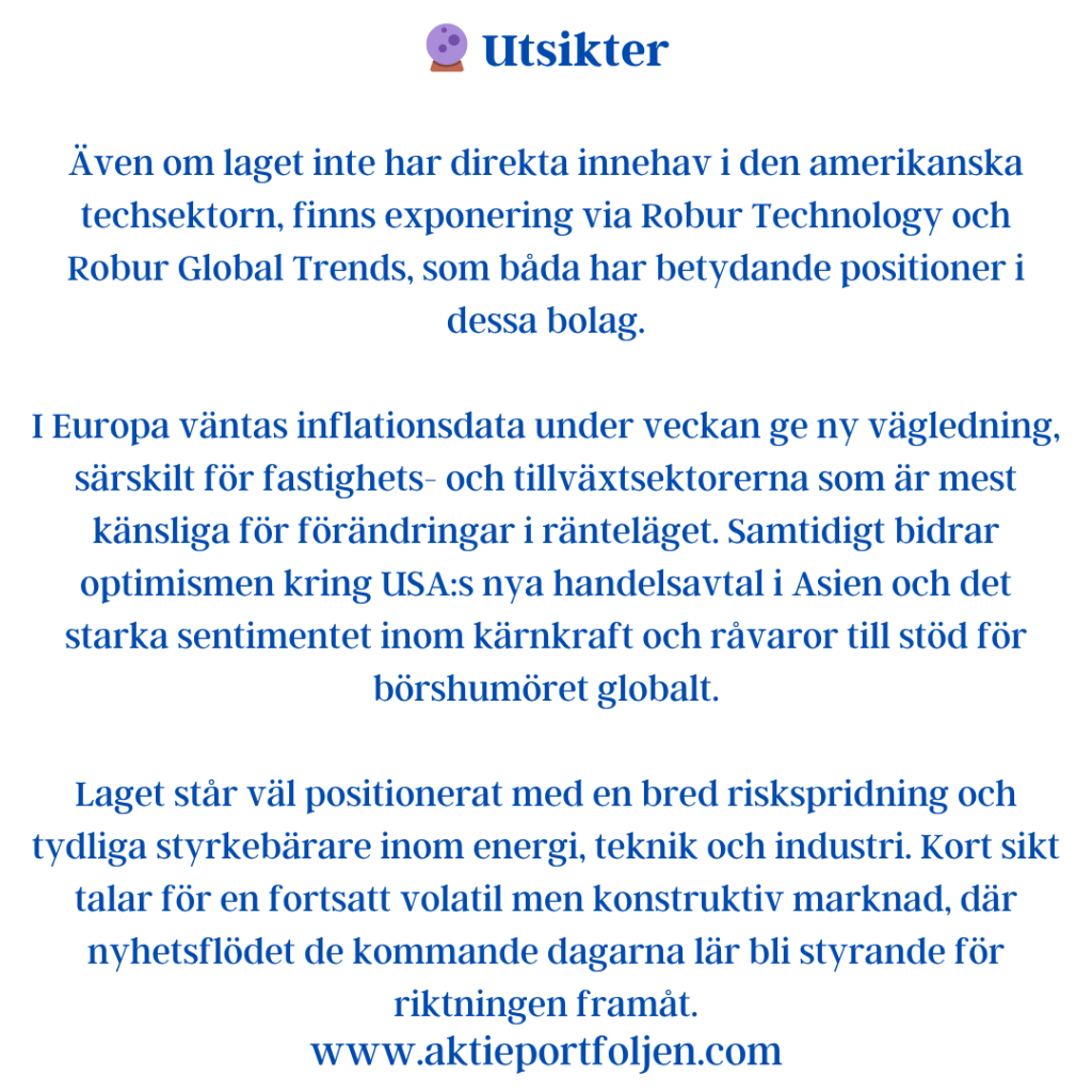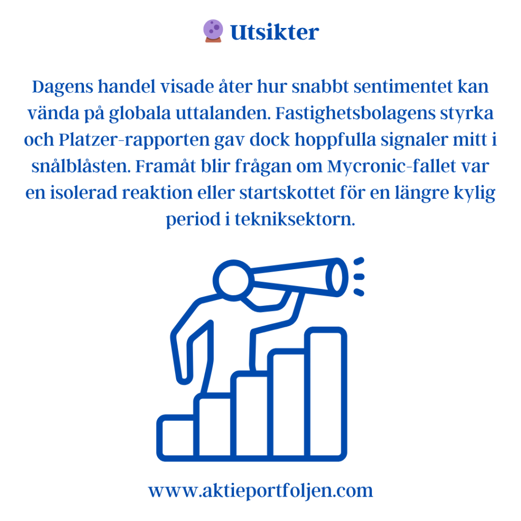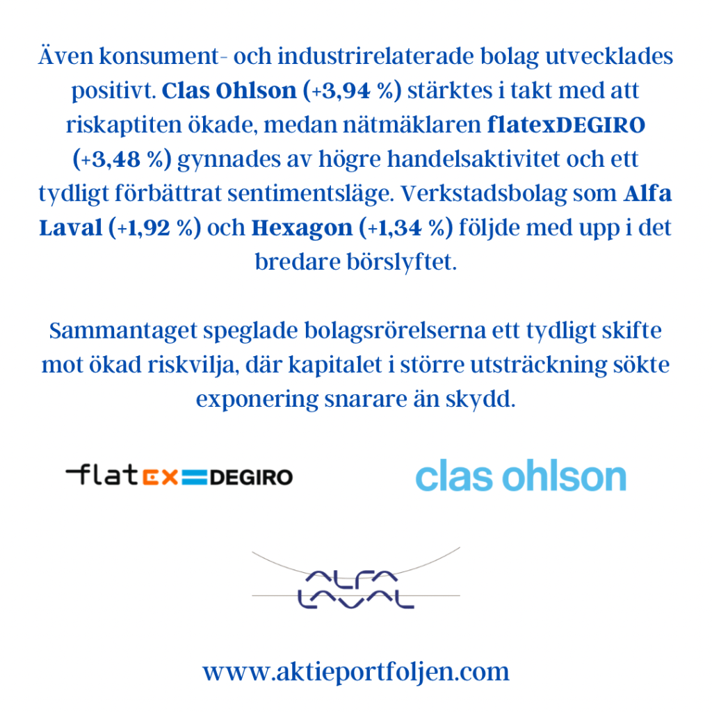 Sammantaget visar indikatorerna ett marknadsläge där riskaptiten finns kvar, men där toleransen för negativa överraskningar är begränsad. Varje nytt politiskt besked eller makroutfall får därmed större genomslag än i ett mer trenddrivet klimat.