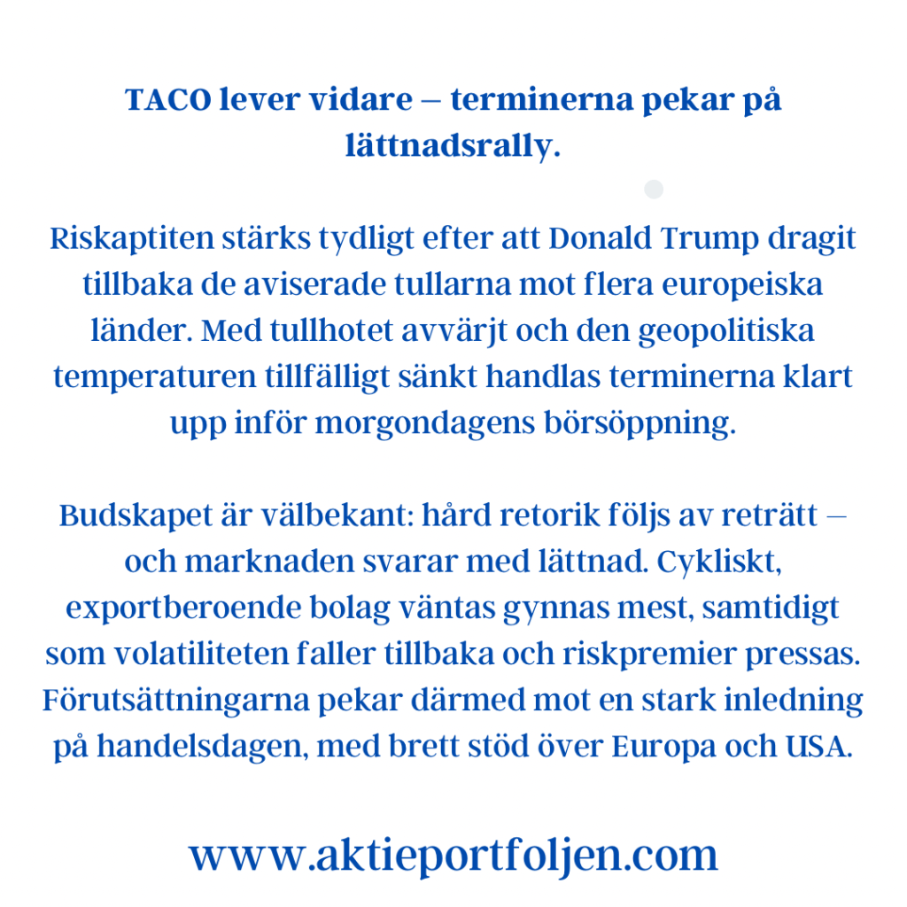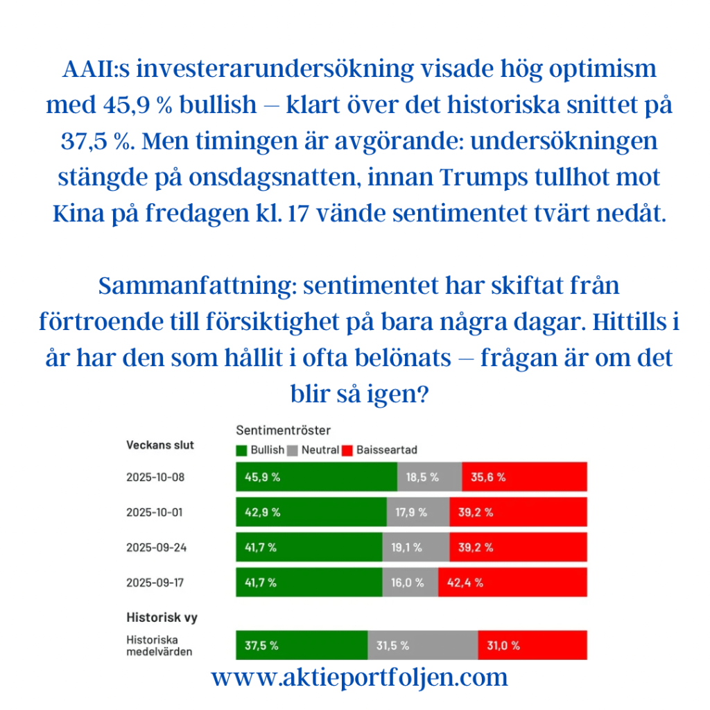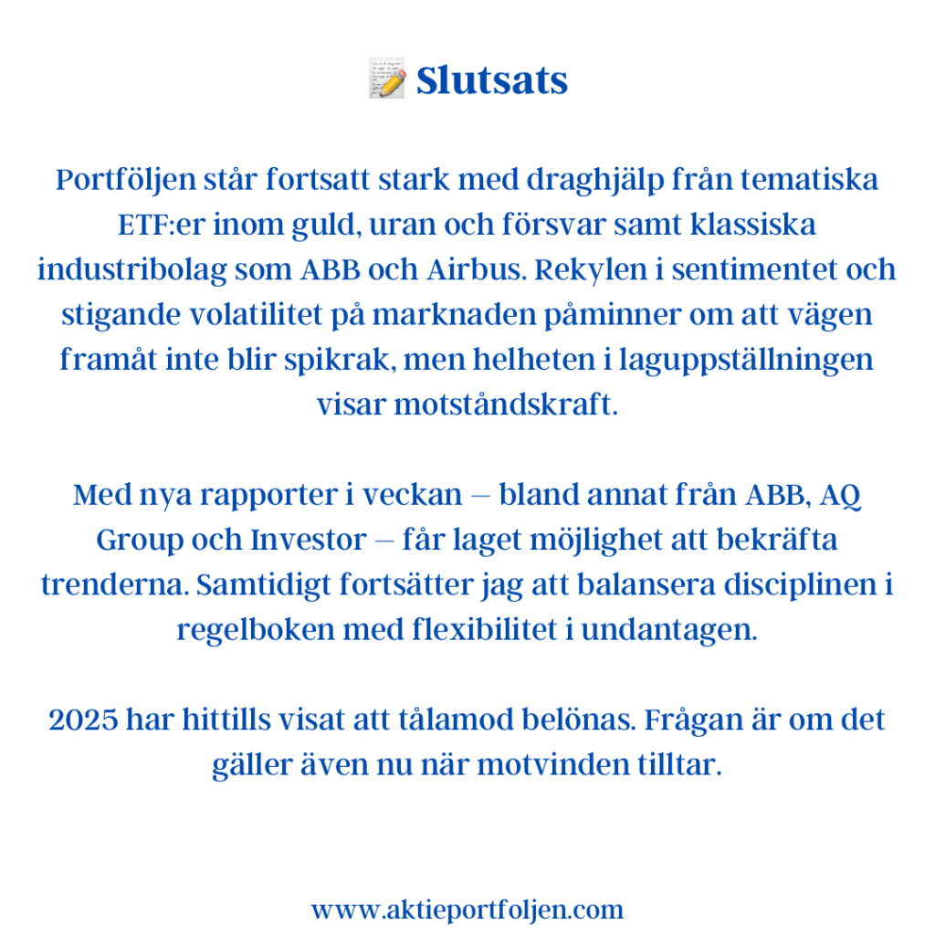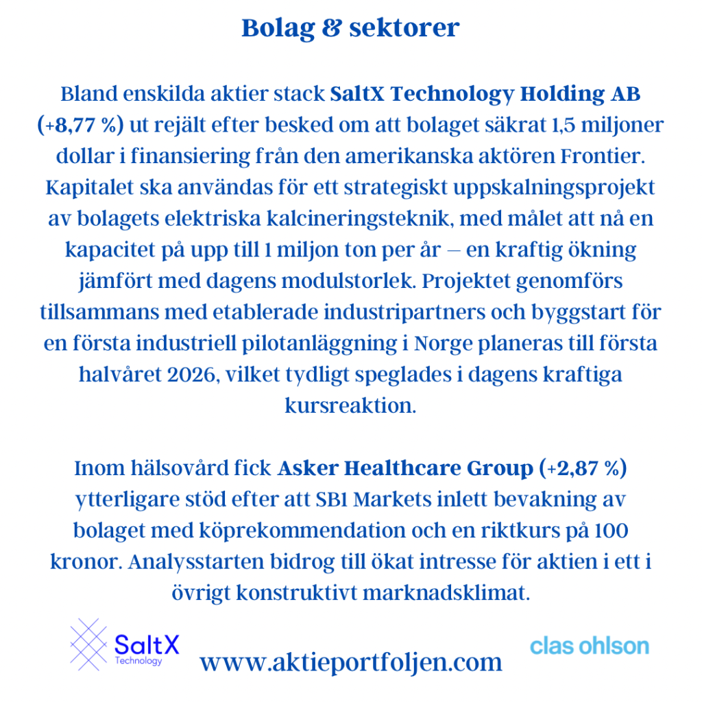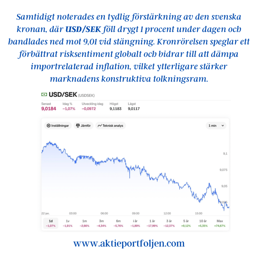 Sammantaget visar indikatorerna ett marknadsläge där riskaptiten finns kvar, men där toleransen för negativa överraskningar är begränsad. Varje nytt politiskt besked eller makroutfall får därmed större genomslag än i ett mer trenddrivet klimat.