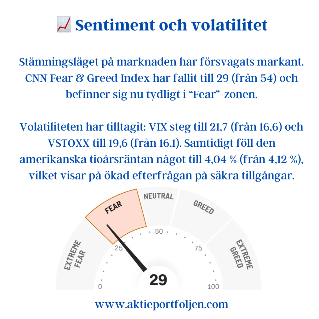 I USA signalerar CNN:s Fear & Greed Index ett lägre värde runt 43, vilket speglar ett mer avvaktande och neutralt sentiment. Skillnaden mot Sverige understryker att amerikanska investerare i högre grad diskonterar politisk osäkerhet och handelspolitiska risker.