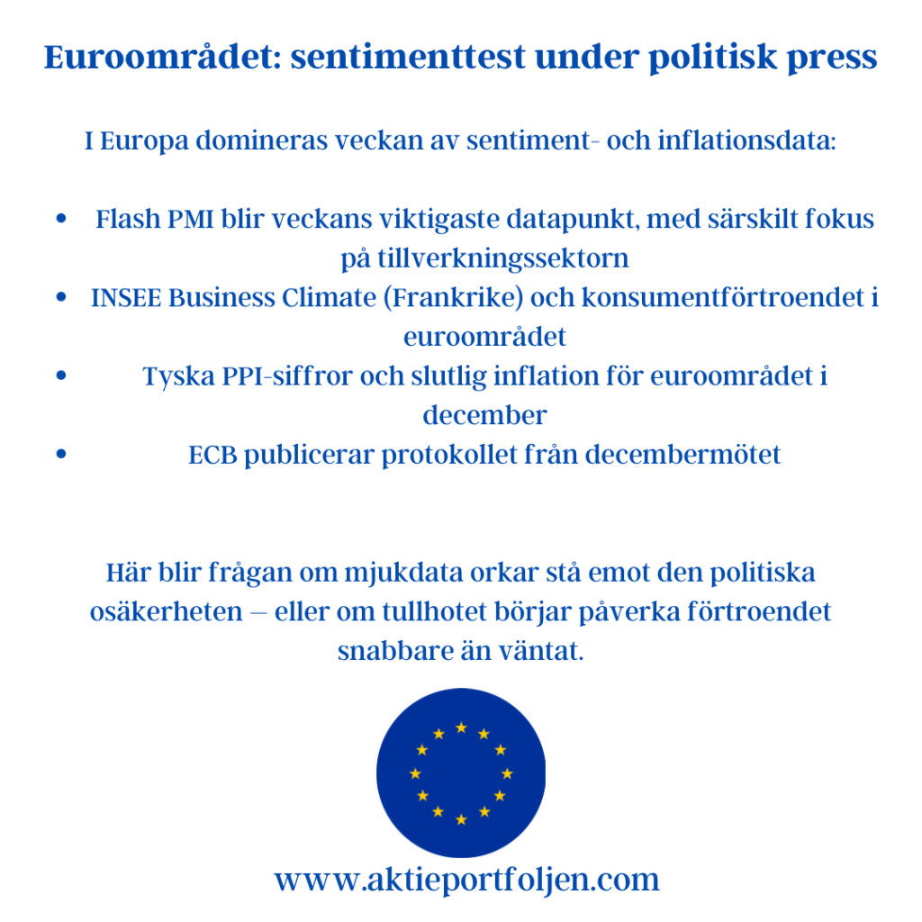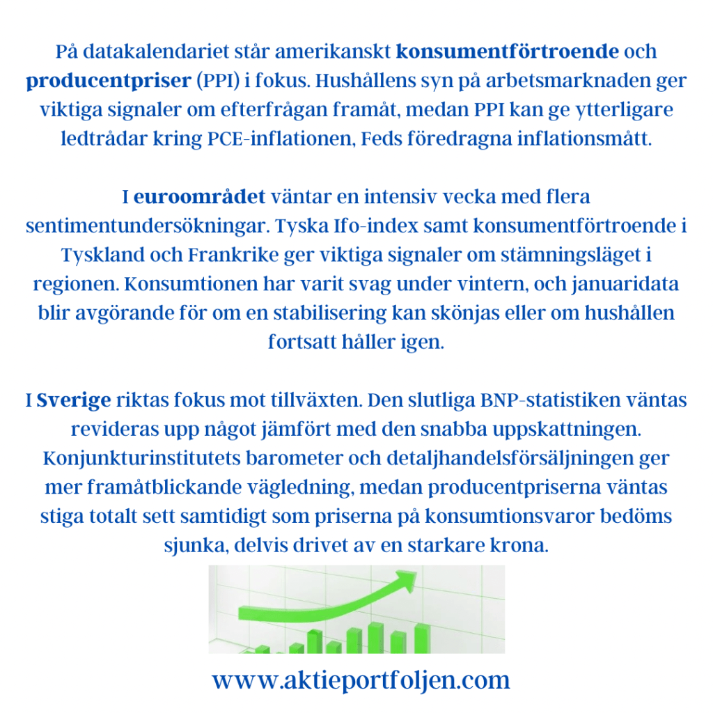 I euroområdet väntar en intensiv vecka med flera sentimentundersökningar. Tyska Ifo-index samt konsumentförtroende i Tyskland och Frankrike ger viktiga signaler om stämningsläget i regionen. Konsumtionen har varit svag under vintern, och januaridata blir avgörande för om en stabilisering kan skönjas eller om hushållen fortsatt håller igen.