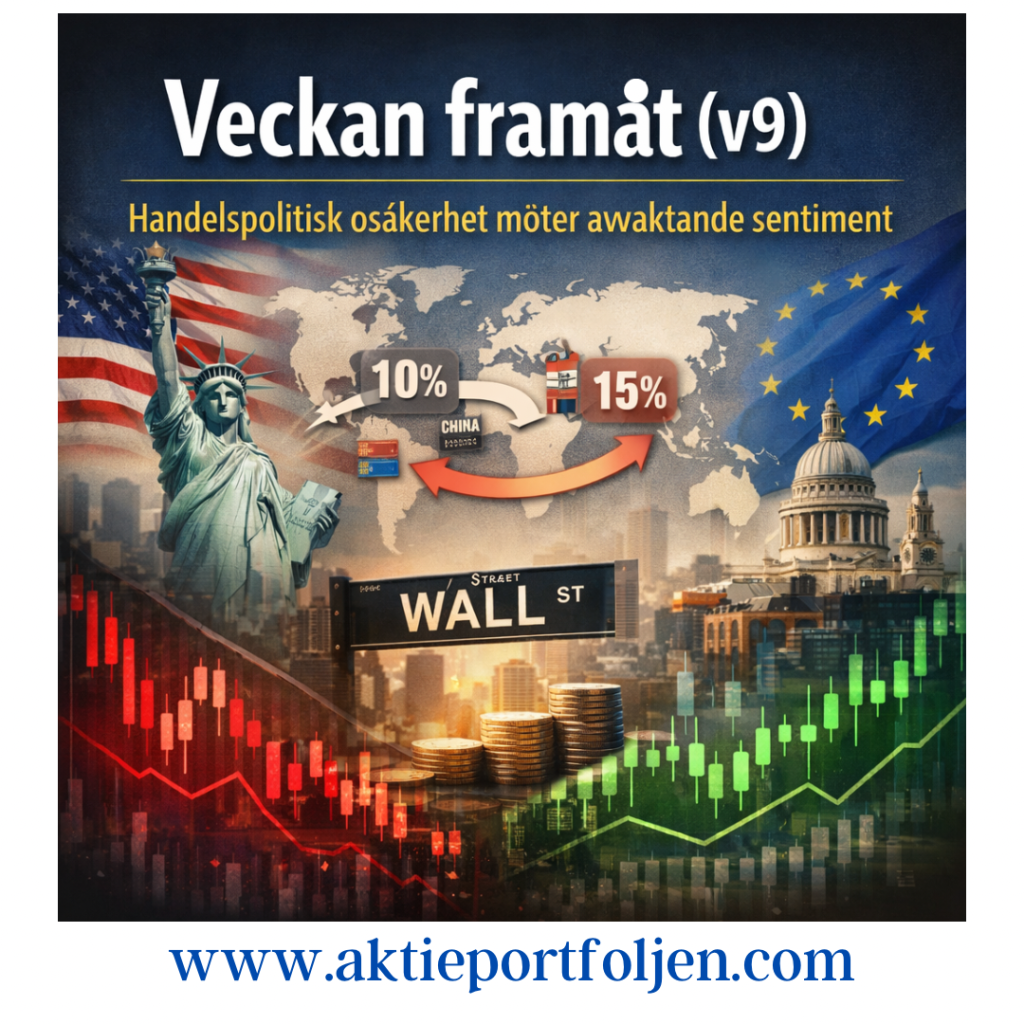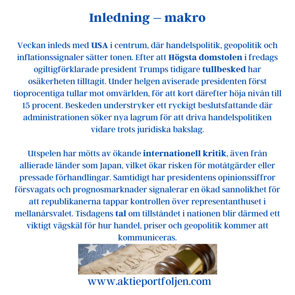 Veckan inleds med USA i centrum, där handelspolitik, geopolitik och inflationssignaler sätter tonen. Efter att Högsta domstolen i fredags ogiltigförklarade president Trumps tidigare tullbesked har osäkerheten tilltagit. Under helgen aviserade presidenten först tioprocentiga tullar mot omvärlden, för att kort därefter höja nivån till 15 procent. Beskeden understryker ett ryckigt beslutsfattande där administrationen söker nya lagrum för att driva handelspolitiken vidare trots juridiska bakslag.