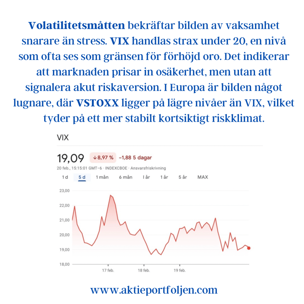 Volatilitetsmåtten bekräftar bilden av vaksamhet snarare än stress. VIX handlas strax under 20, en nivå som ofta ses som gränsen för förhöjd oro. Det indikerar att marknaden prisar in osäkerhet, men utan att signalera akut riskaversion. I Europa är bilden något lugnare, där VSTOXX ligger på lägre nivåer än VIX, vilket tyder på ett mer stabilt kortsiktigt riskklimat.