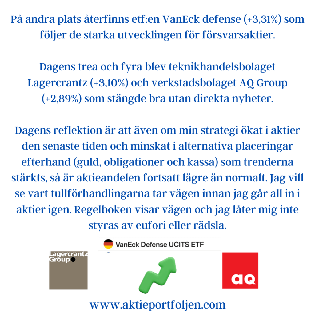 På tredje plats kom aliminiumbolaget Gränges (+2,28%) som har en stark position i USA, vilket skyddar mot tullrelaterade risker.