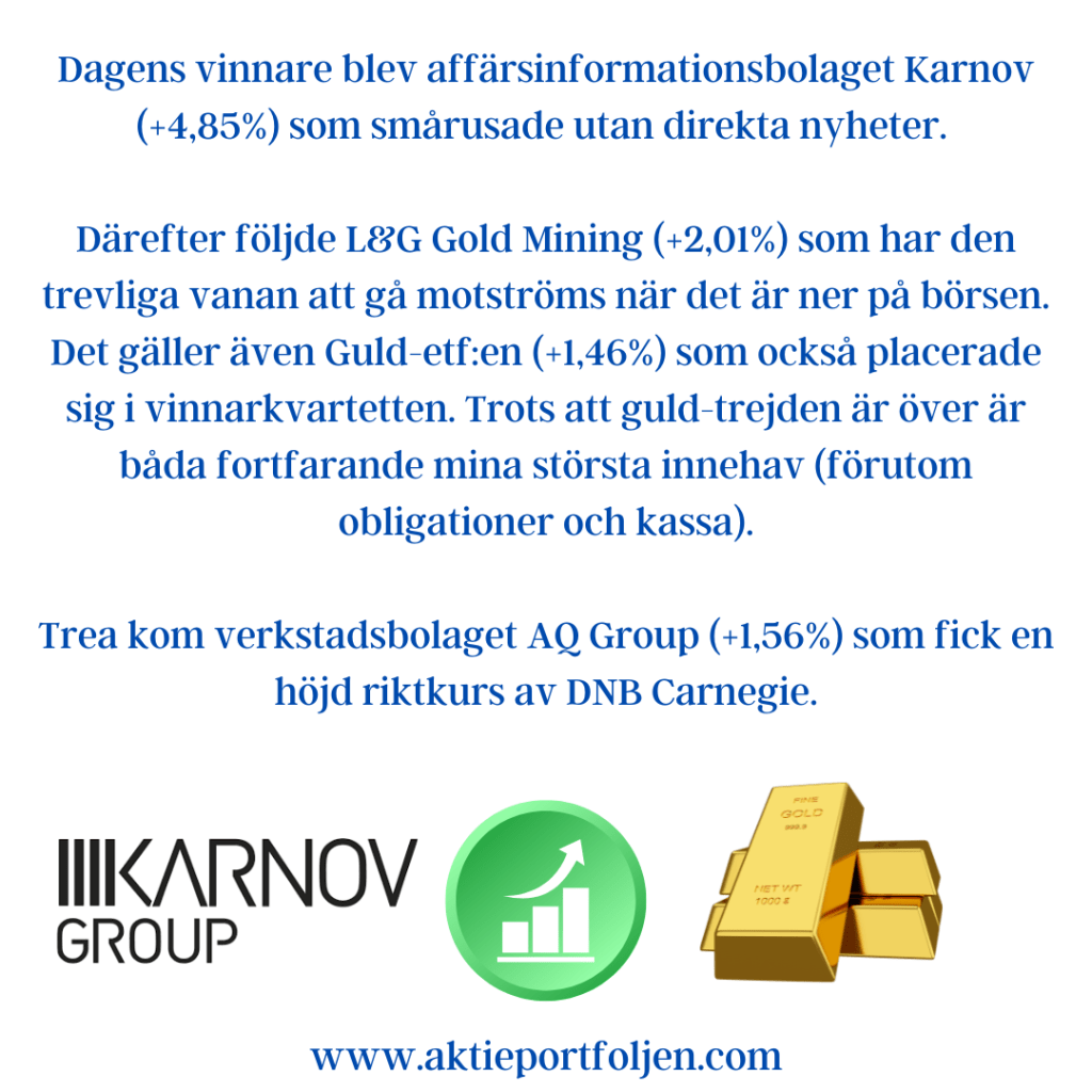 Därefter följde L&G Gold Mining (+2,01%) som har den trevliga vanan att gå motströms när det är ner på börsen. Det gäller även Guld-etf:en (+1,46%) som också placerade sig i vinnarkvartetten. Trots att guld-trejden är över är båda fortfarande mina största innehav (förutom obligationer och kassa).