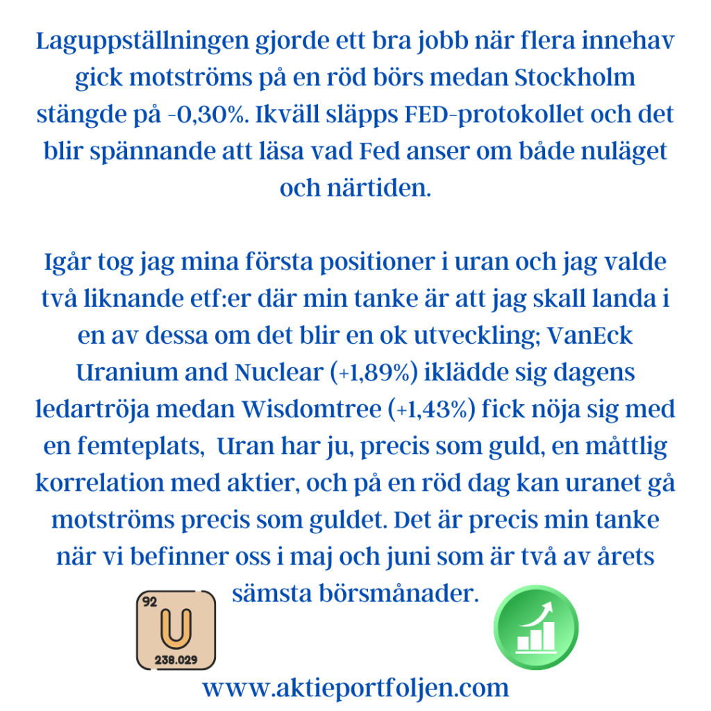 Igår tog jag mina första positioner i uran och jag valde två liknande etf:er där min tanke är att jag skall landa i en av dessa om det blir en ok utveckling; VanEck Uranium and Nuclear (+1,89%) iklädde sig dagens ledartröja medan Wisdomtree (+1,43%) fick nöja sig med en femteplats, Uran har ju, precis som guld, en måttlig korrelation med aktier, och på en röd dag kan uranet gå motströms precis som guldet. Det är precis min tanke när vi befinner oss i maj och juni som är två av årets sämsta börsmånader.
