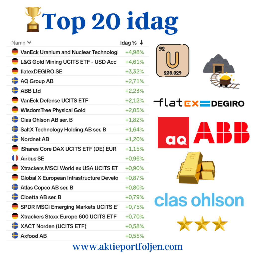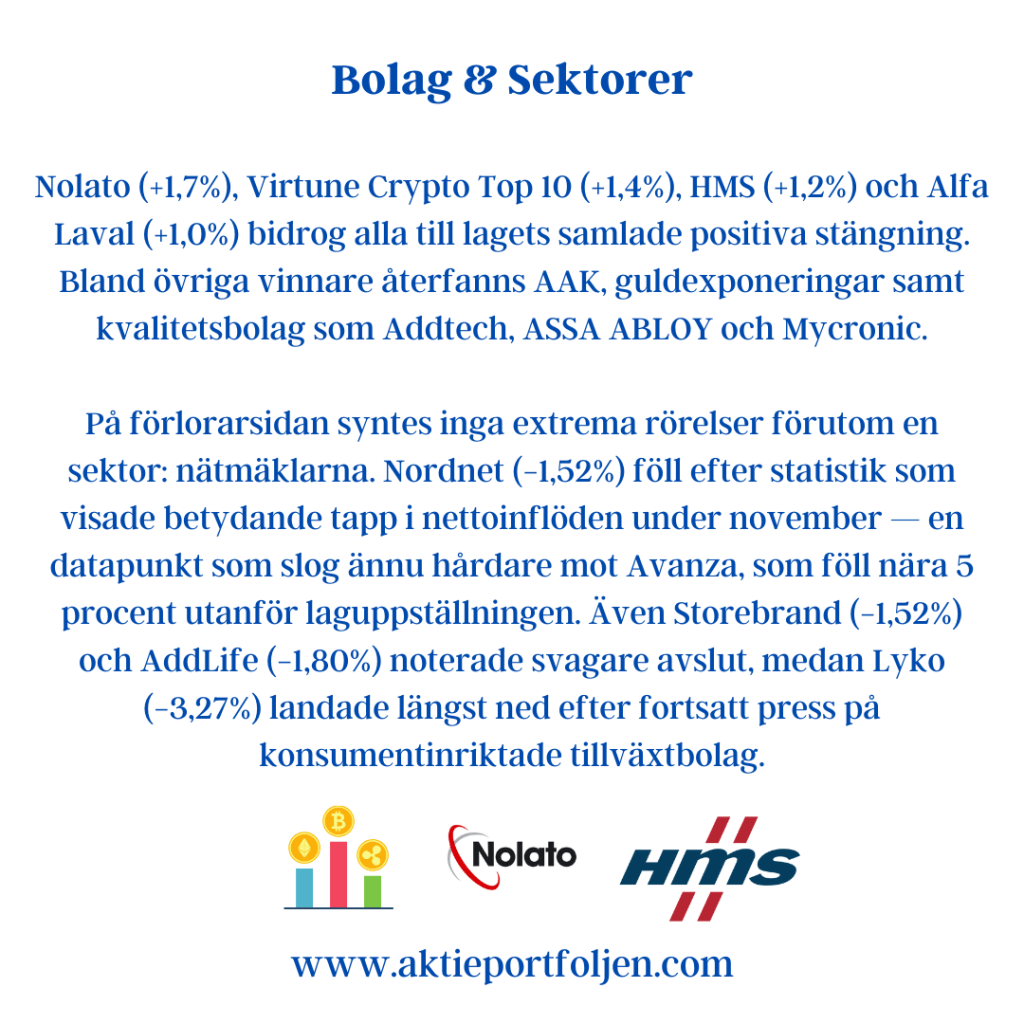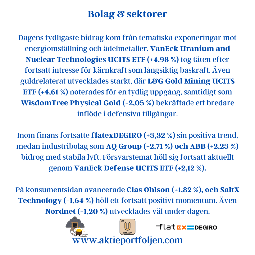 De mest pressade sektorerna studsade högst – framför allt råvaror och industri. Investmentbolag och cykliskt gick starkt när riskaptiten återvände. Kapital flödade brett in i marknaden via ETF:er kopplade till Sverige, Japan och tillväxtmarknader.