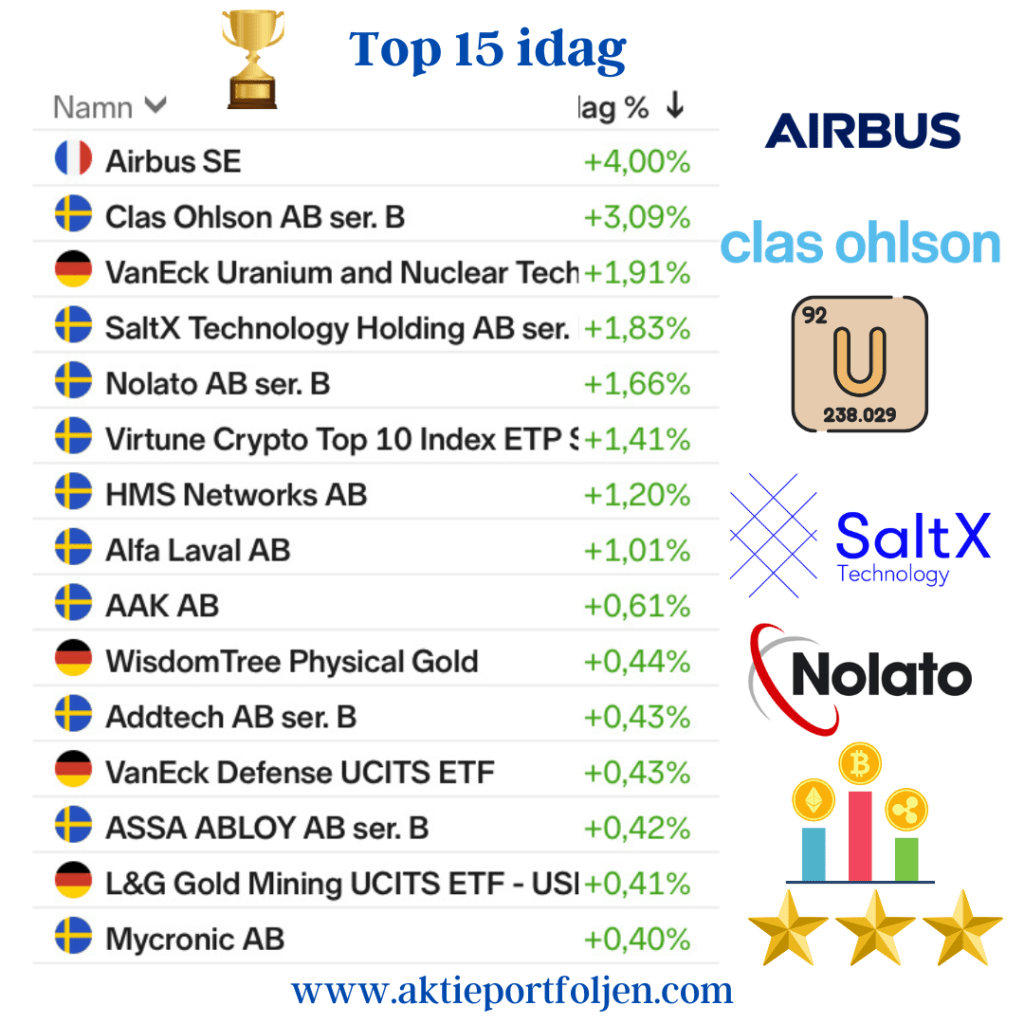 Investor AB B +3,25 % Linc AB +3,09 % Svolder AB B +2,94 % L E Lundbergföretagen AB +2,77 %