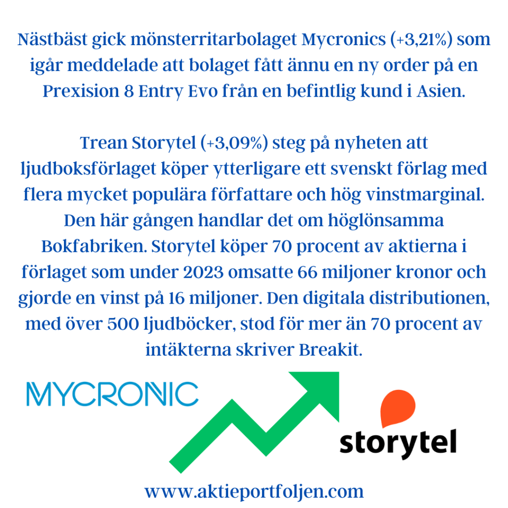 Topplistan dominerades av Hexagon. Men om vi ser bortom den nya bevakningsposten, var det SaltX Technology som stod för den starkaste utvecklingen, med en uppgång på hela +3,74% trots inga specifika nyheter. GreenTechbolaget fortsätter att imponera, med en uppgång på +200% i år.