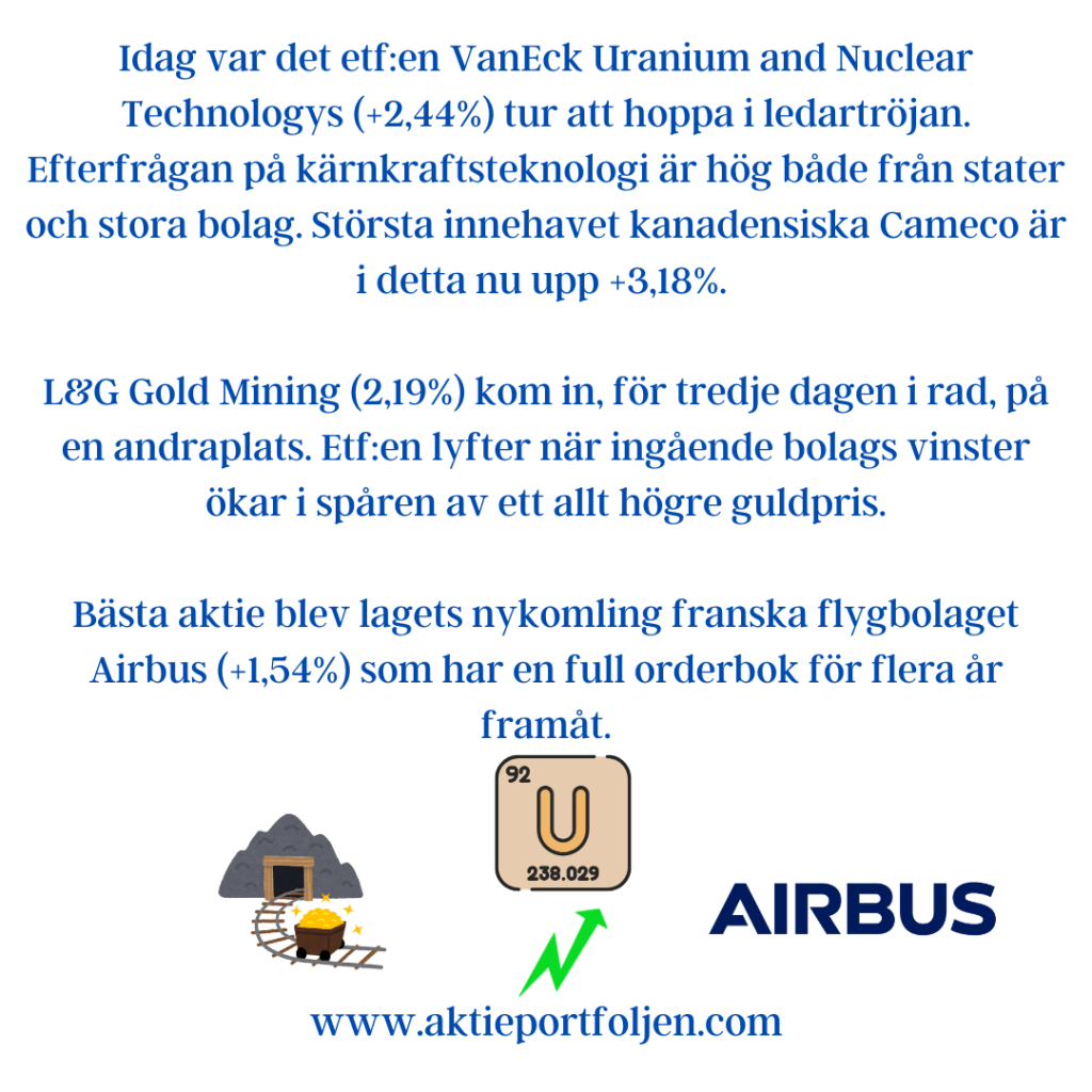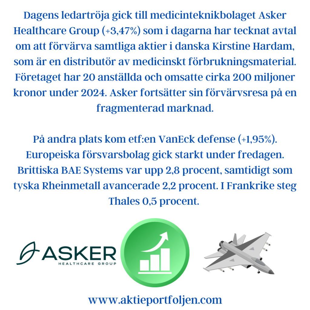 Dagens stora snackis var Hexagon, som rusade +7,36% och tog ledartröjan i OMXS30. Uppgången följde på nyheten att mätteknikbolaget säljer sin verksamhet Design & Engineering för 30 miljarder kronor. Trots det rejäla lyftet ligger aktiens värdering fortfarande under sitt femårssnitt, vilket ledde till att jag tog en mindre bevakningsposition. Nästa vecka får avgöra om jag ska öka.