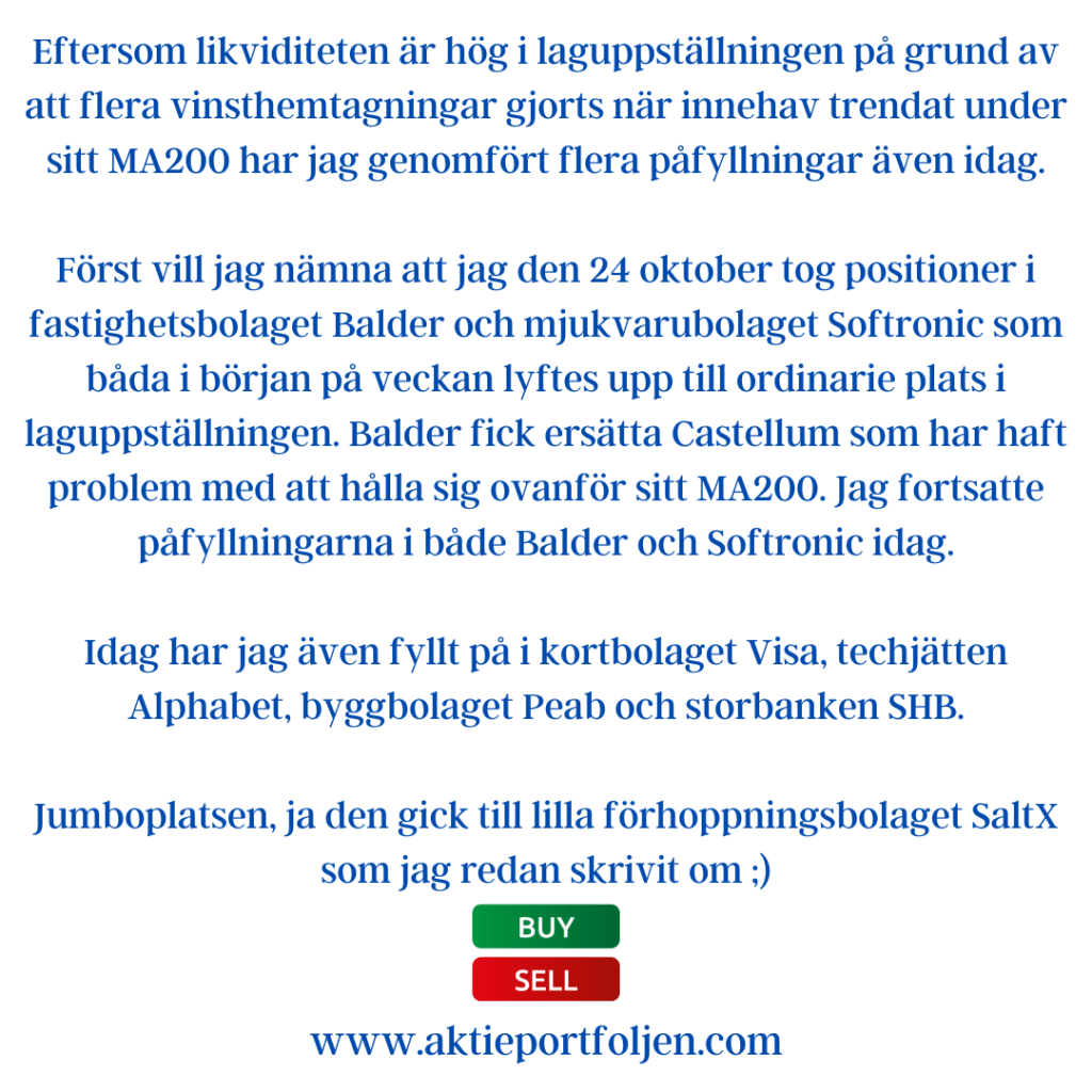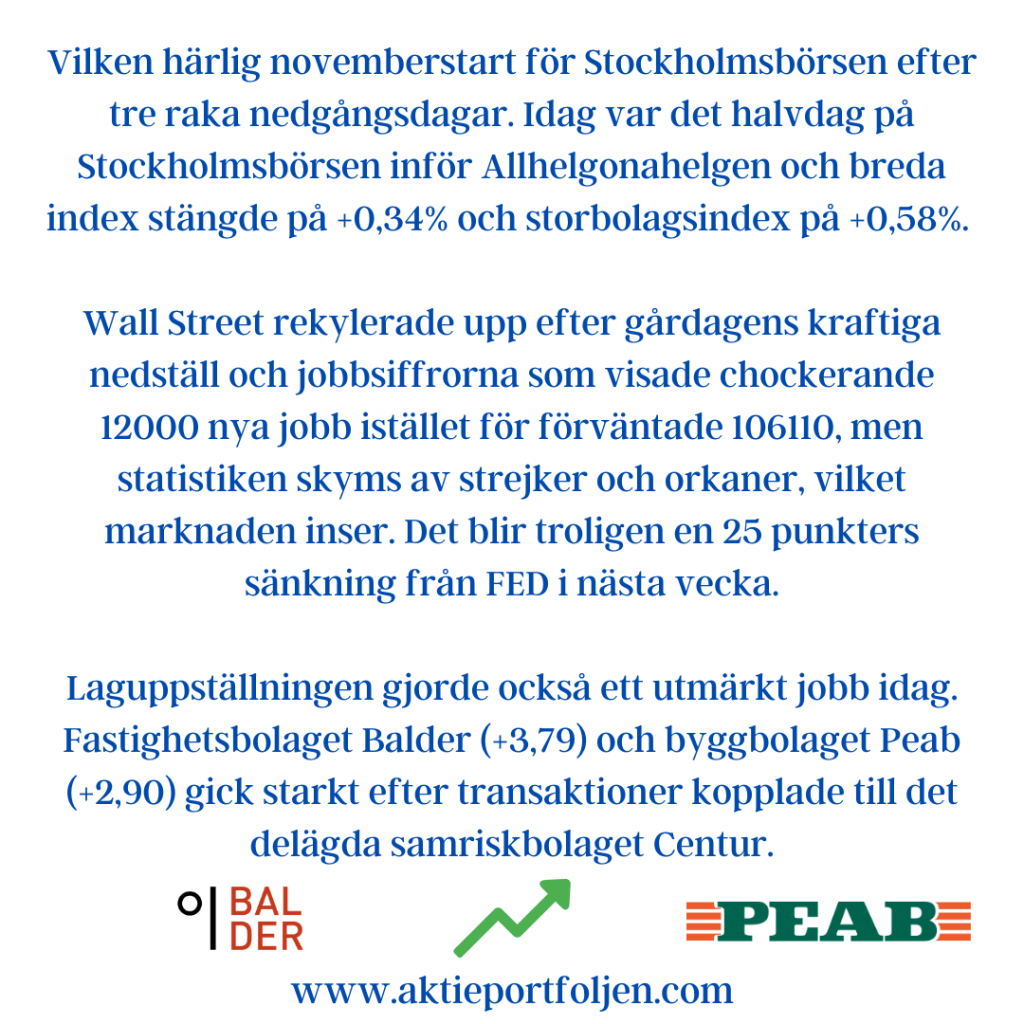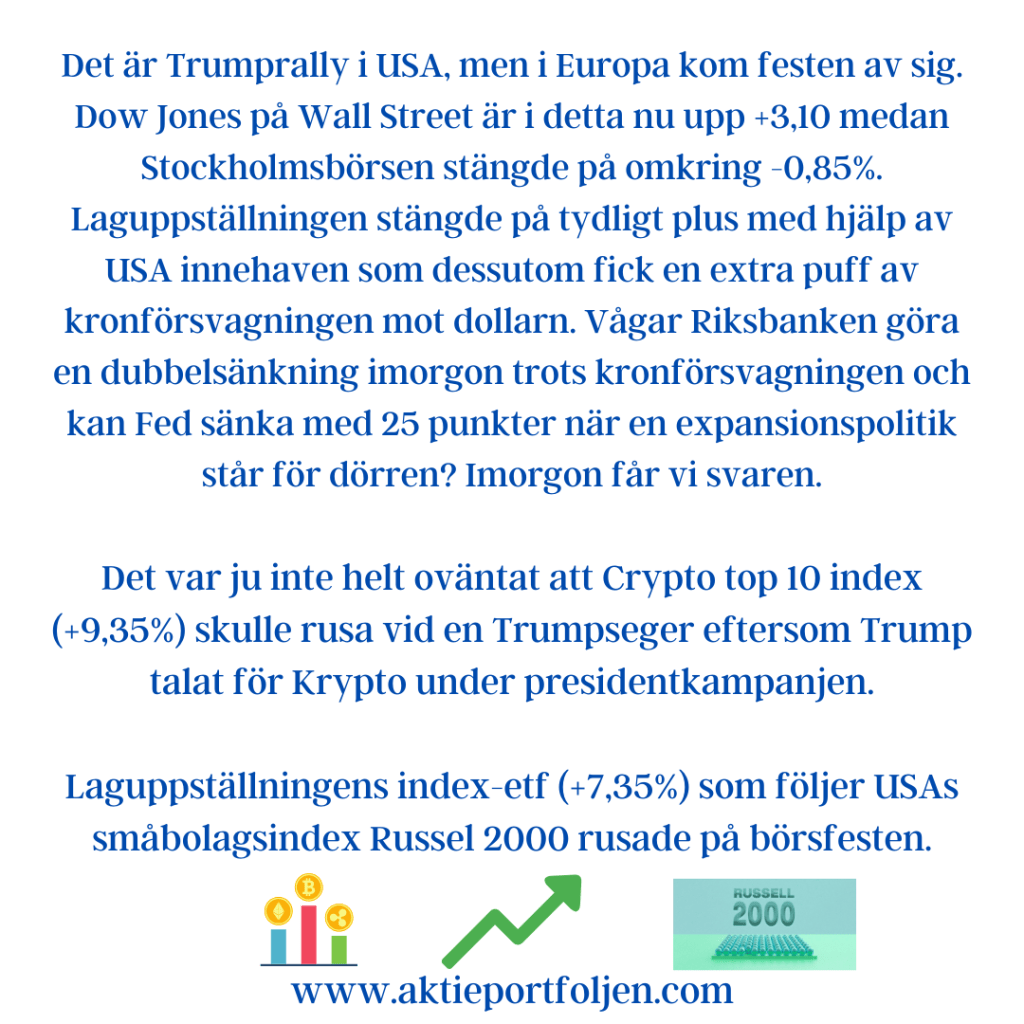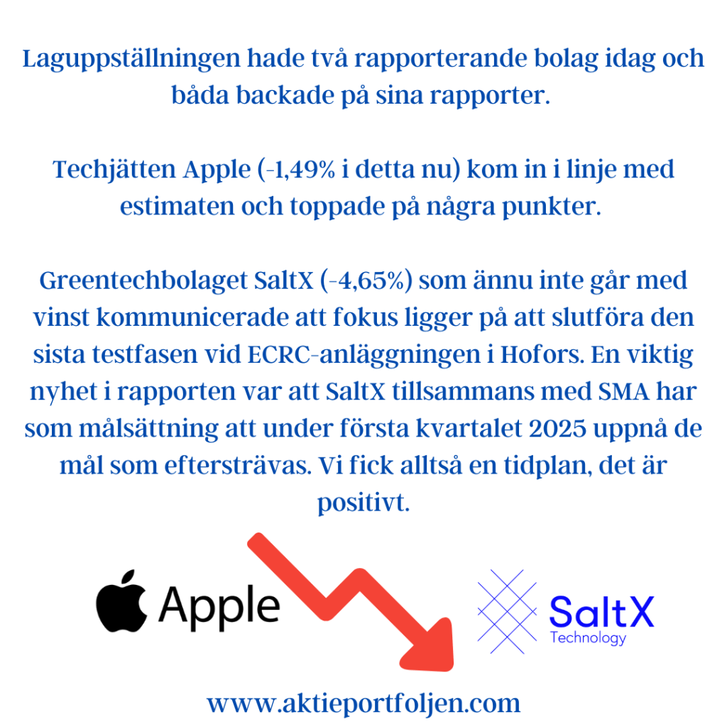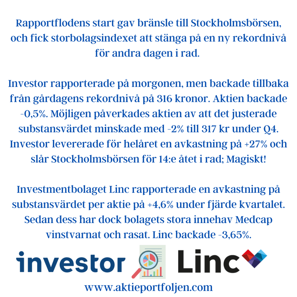 Investor rapporterade på morgonen, men backade tillbaka från gårdagens rekordnivå på 316 kronor. Aktien backade -0,5%. Möjligen påverkades aktien av att det justerade substansvärdet minskade med -2% till 317 kr under Q4. Investor levererade för helåret en avkastning på +27% och slår Stockholmsbörsen för 14:e åtet i rad; Magiskt!