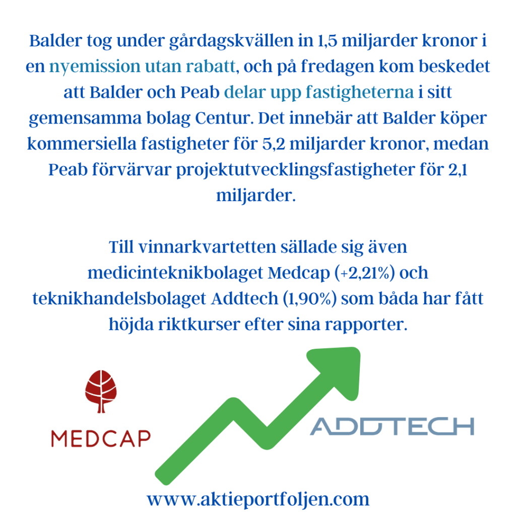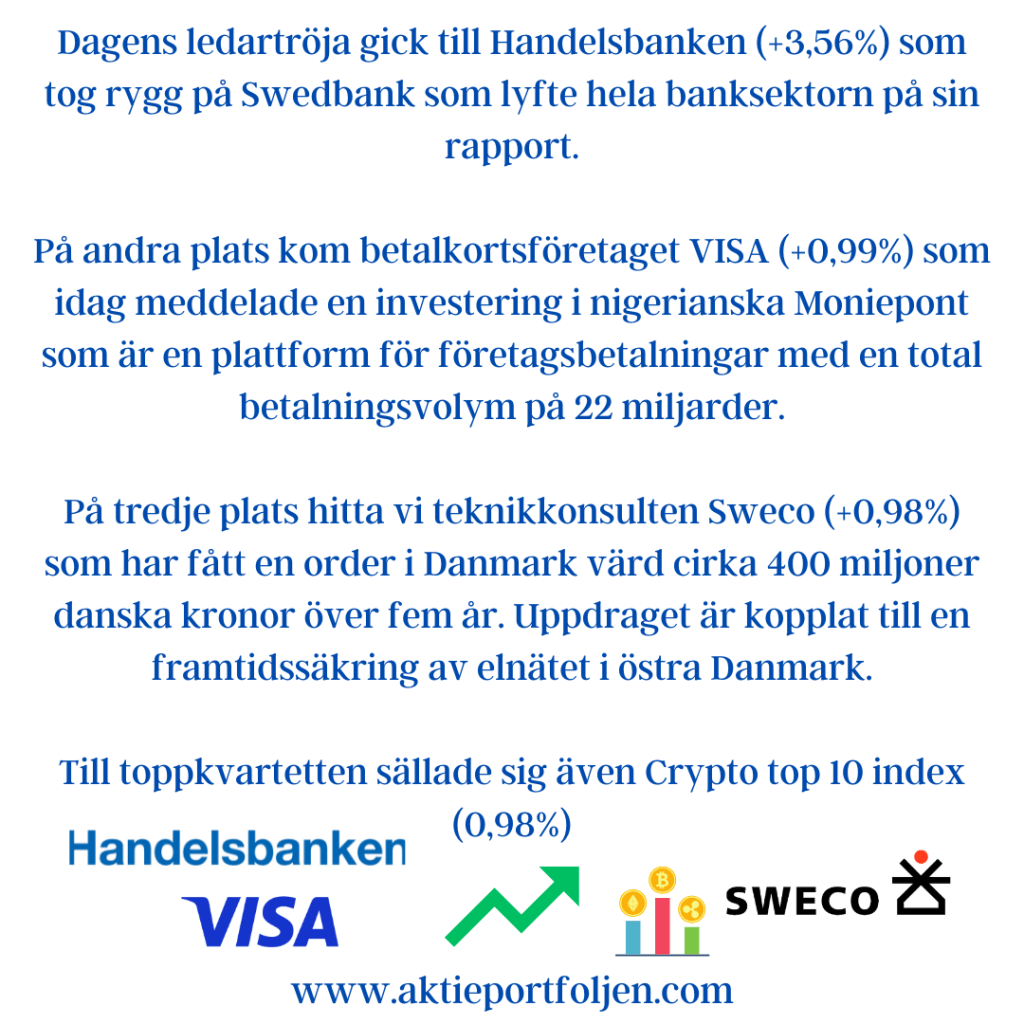Dagens ledartröja gick till Handelsbanken (+3,56%) som tog rygg på Swedbank som lyfte hela banksektorn på sin rapport.