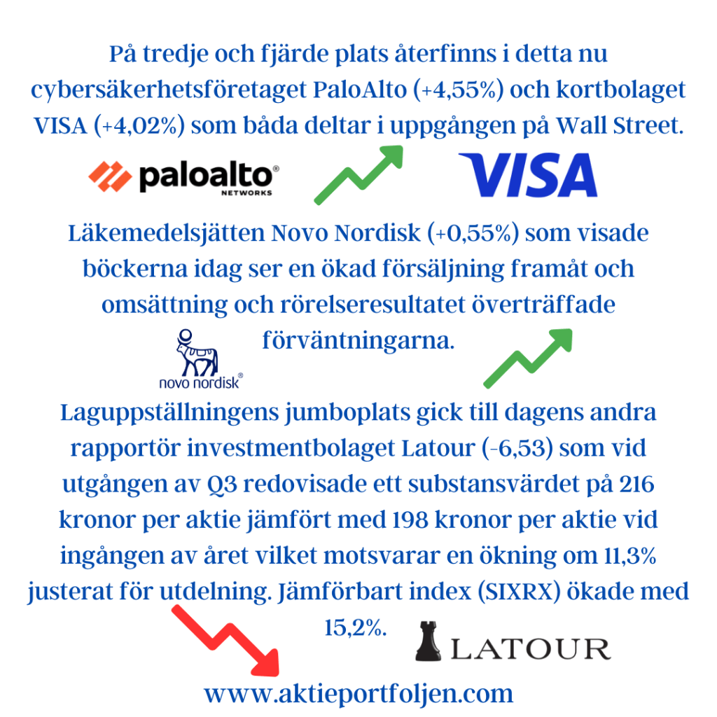 På andra plats kom betalkortsföretaget VISA (+0,99%) som idag meddelade en investering i nigerianska Moniepont som är en plattform för företagsbetalningar med en total betalningsvolym på 22 miljarder.