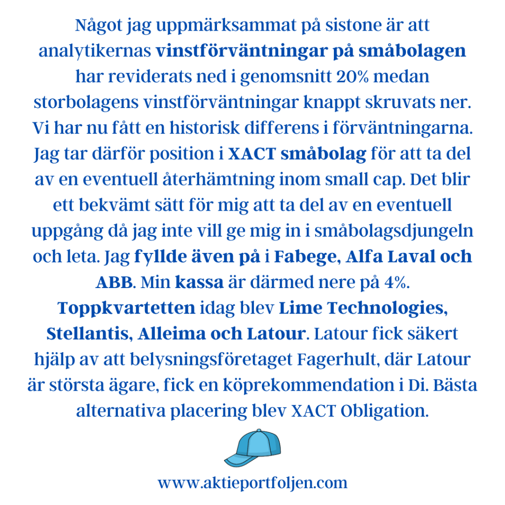 Stockholmsbörsen stänger på plus för fjärde dagen i rad. Jag passade på att ta hem vinst och allokera ned åtta innehav med hög volatilitet som rusat den senaste tiden. Jag ökade i tre innehav med låg volatilitet. För att inte tappa fart i ett fortsatt småbolagsrace överviktar jag i XACT småbolag och ställer in stop/loss på den överviktade delen som en gardering . Latour deltar i småbolagsuppgången och tar ledartröjan för andra dagen i rad. Stellantis tog andraplatsen och möjligen hjälpte nyheten om en jätteanläggning för vätgas till. Trean Atlas Copcos aktie nådde idag rekordnivåer och fyran Xact småbolag bekräftar att det går bra för småbolagen.